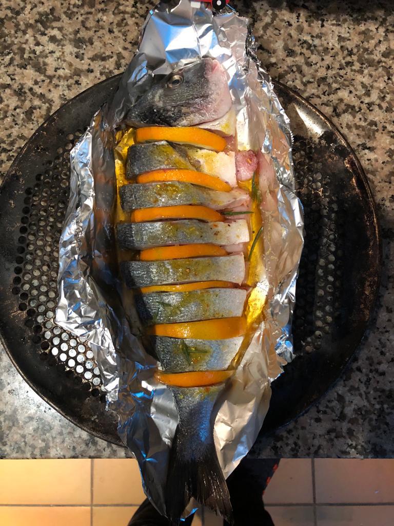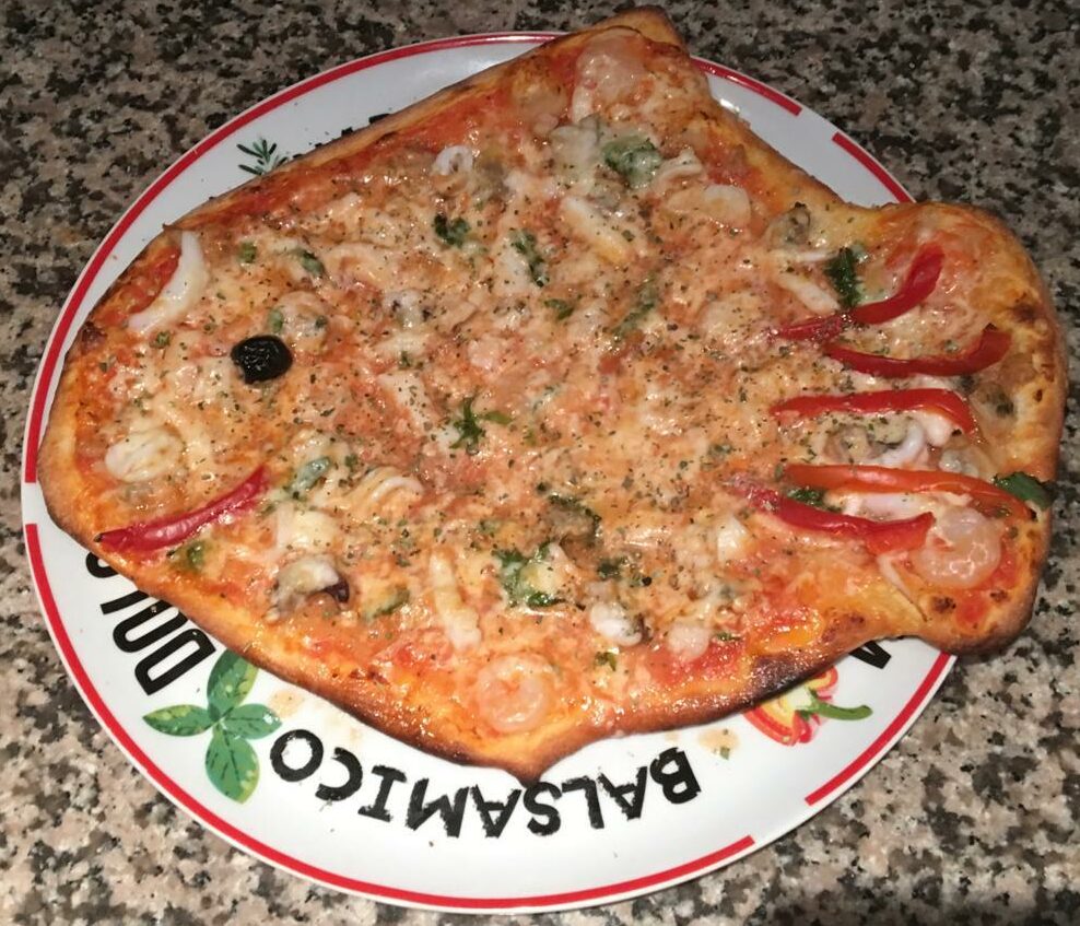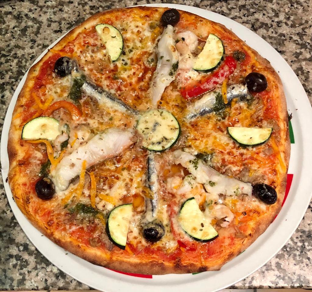 Pizza mit Zucchini, frischen Sardellen und frischem Schwertfisch