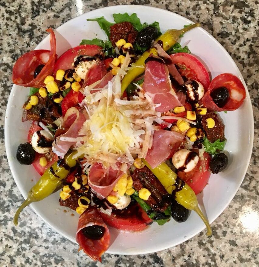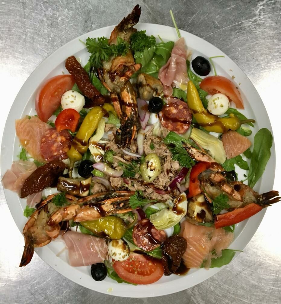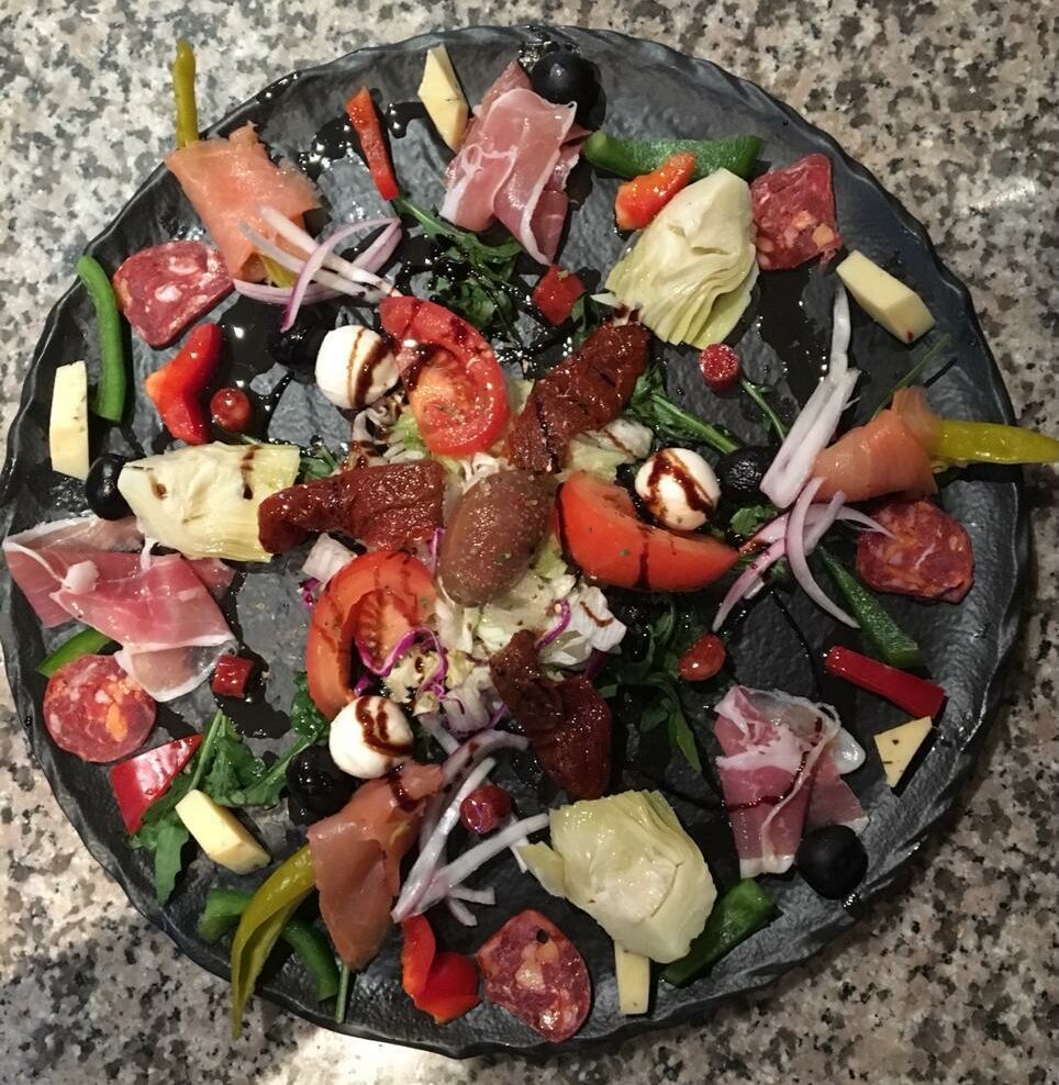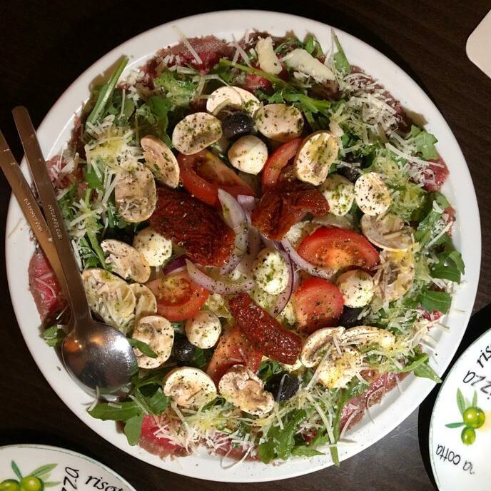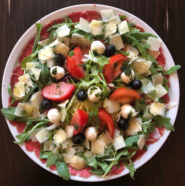 Rindercarpaccio mit Mozzarellasalat, getrockneten Tomaten und Champignons